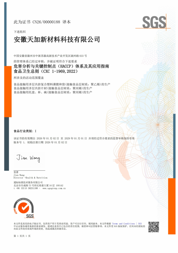 关于我们天加新材料集团股份有限公司是国内的生鲜肉包装整体解决方案提供商,服务各地肉类屠宰加工企业,主要提供生鲜肉生产及肉制品加工所需的各种新型包装材料。公司根据客户产品类别和市场定位,提供从包装方案优化、包装设备选型、生产现场规划及增值服务等一系列包装整体解决方案。涵盖热缩包装、气调包装、贴体包装等所需的各种材料、设备以及现场规划、消毒杀菌、技术培训等各项服务。包装材料有热收缩膜(袋)、气调盒、贴体盒等。天加引进了德国制造、世界一流的全伺服10+10色卫星式柔版印刷机,最高能实现双面20色正反对位、套色精准的印刷。